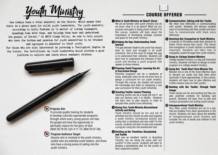 This program is designed to provide quality training for students to develop culturally appropriate programs through which every young person will hear the gospel and have the opportunity to spiritually mature for the glory of God.